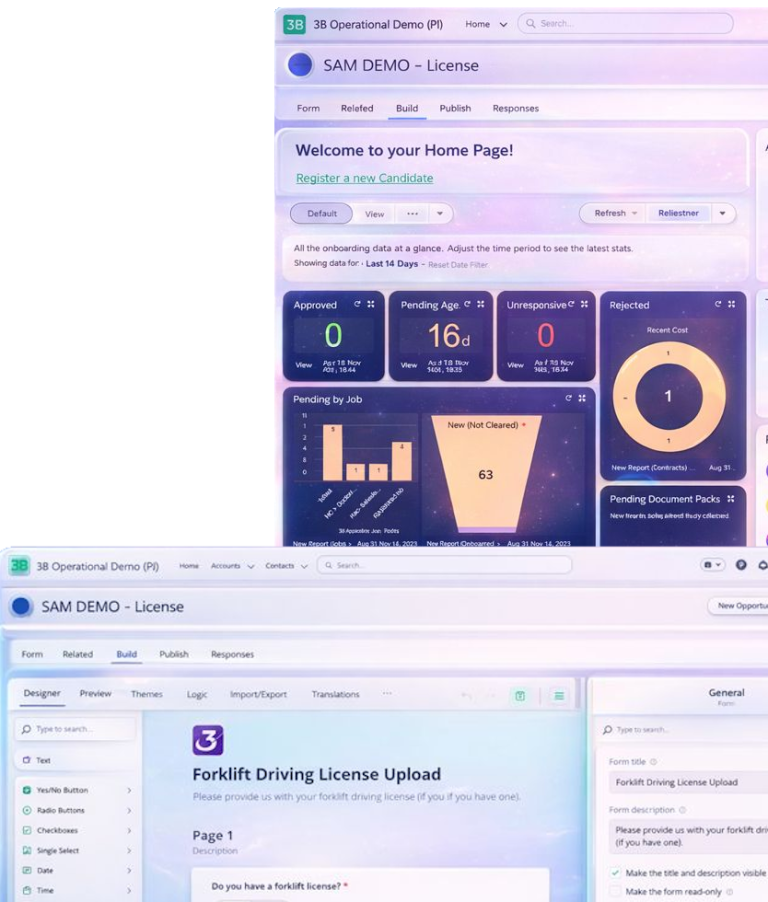 Everything starts with structured data capture. Using Salesforce-native forms, candidates, workers, clients or suppliers submit information through branded, mobile-friendly journeys. Conditional logic ensures you only ask what is relevant, reducing friction and errors from the outset.